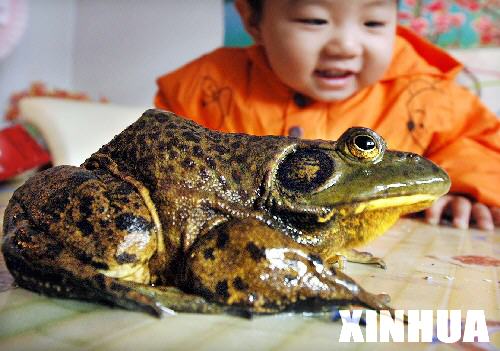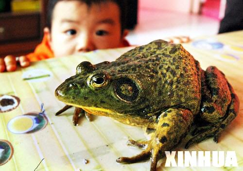 该巨蛙一斤多重、一尺多长。这是一个小男孩正在观察“巨蛙”。 新华社记者 李紫恒 摄