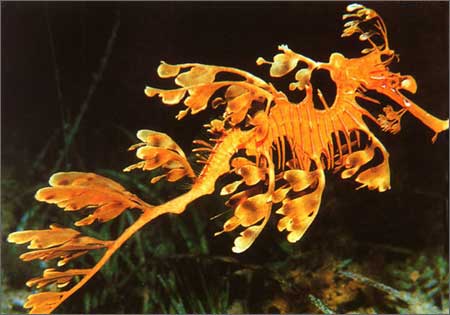 叶海马——生活在澳洲的叶海马,形态模拟周围的物体,全身长有许多叶形突出物和丝状体,像马尾藻一样,在海里缓缓漂荡,使对手很难辨认。而竹节蝗和枯叶蝶,以它们的形态和所附着的茎叶酷似而叫绝