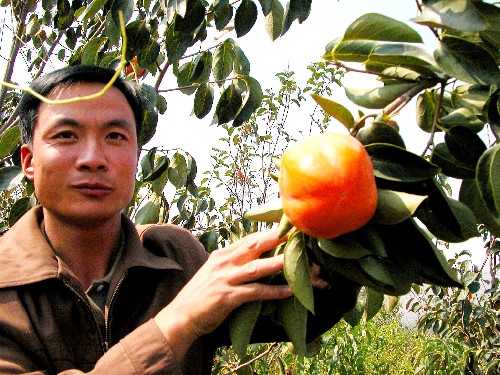 枣庄农民展示自己种植的巨型牛心柿子。据介绍,这种巨型牛心柿子是山东省枣庄市从韩国引进的,平均单果重约400克,最重可达820克,目前已在当地上市。