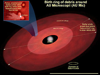 研究人员利用哈勃空间望远镜镜头上的偏光滤片来观测Au Microscopii发出的主要光线所形成的痕迹,因此只有星球残骸反射掉的光线是可见的。