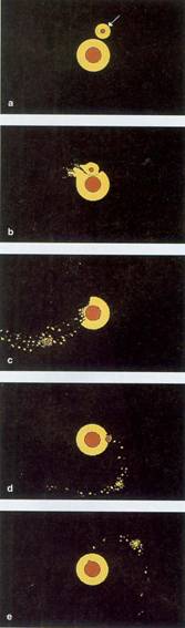 碰撞分裂假说过程的电脑模拟图。 1974年以前,对月球的起源存在三种假说:一种认为月球是地球的“夫人”,即俘获假说,认为月球是地球从其他轨道上俘获来的;第二种认为月球是地球的“女儿”,即分裂说,认为月球是原地球直接分裂出来的;第三种认为月球是地球的“姐妹”,即共生说,认为月球与地球是从同一片原始星云中凝聚生成的。