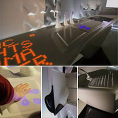 Z. Island未来型厨房在光滑的表层内部安装看不见的加热膜片、2000个发光二极管(穿过桌面塑胶发光),它们能显示不同的信息:例如发光二极管系统能显示准备时间。