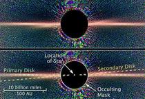 为了拍摄光比尘埃圆盘明亮很多的恒星曾动用日冕仪,日冕仪能阻断来自恒星的光,从而能看到暗淡很多倍的尘埃圆盘。两尘埃圆盘平面之间的夹角约为4°,并且第二个倾斜圆盘离开恒星的距离至少为400亿千米。如果根据原有的理论,则第二个尘埃圆盘会拥有行星,行星的质量可以达到木星质量的20倍。这一发现也证实这样一个假设,即行星能在两个不同平面里形成,这一点恰恰在太阳系中观察到。