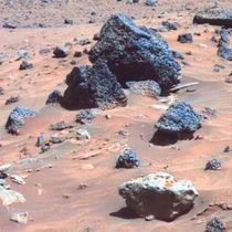 所示照片是美国宇航局“勇气”号火星车上全景照相机在2006年4月12日拍摄火星地表照片的综合,拍摄时利用了波长为753、535和432纳米不同的滤光镜。综合照片上的颜色已经发生改变,以便着重指出岩石与土壤结构之间的差别。从照片上可以清楚地看出,位于照片前面的那块石头明显与稍远处的那些石头不同,它在颜色上显得更浅些和在结构上更光滑些。负责这项火星计划的专家给这块石头非正式地命名为“Allan Hills”,专家认为,它很可能是一块铁陨石,很久以前坠落到火星上(如同坠落到地球上的陨石)。