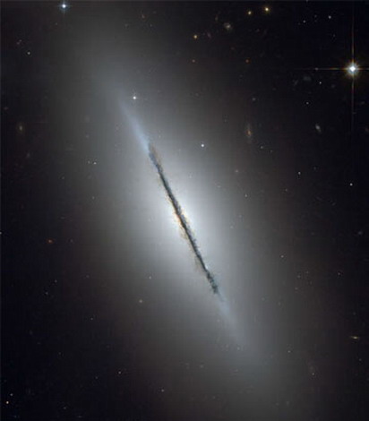 NGC 5866星系是旋涡星系,但实际上它是以侧面朝向我们,因此它看上去像一根细条。尽管视场如此“片面”,“哈勃”太空望远镜仍能详细拍摄到NGC 5866星系的某些细节,NGC 5866星系直径约为6万光年(我们银河系的大小约为10万光年),但是NGC 5866星系的质量几乎与我们银河系质量相当。