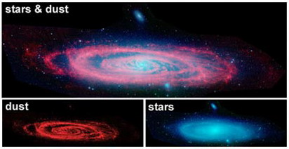 不久前“斯皮策”太空望远镜对仙女星系进行了拍摄,由于该星系范围太大,所以要拍摄到仙女星系全照很不容易,仙女星系总图像由3000幅单独照片编制而成。因为“斯皮策”太空望远镜工作在红外线波段,因此它能拍摄到星系中的尘埃分布,在照片上部尘埃呈现为红色,而古老恒星则呈现为天蓝色。尘埃由 < 1 > < 2 >