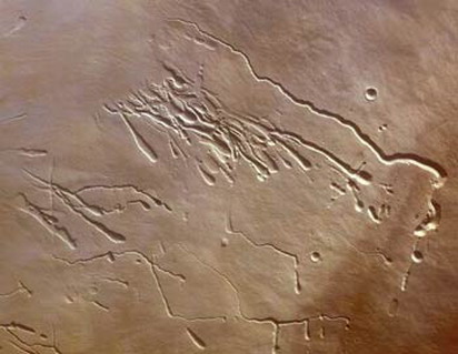 事实上,Pavonis Mons火山没有陡坡,是一个非常平缓的慢坡,科学家认为,这些慢坡多半主要是由火山喷发时流出的熔岩流形成。从照片上一眼看到的无序曲线分布在火山山坡的西南部,这些曲线是炽热熔岩流形成的熔岩管道或渠道,冷却时在这些熔岩流表面形成一层坚硬外壳,熔岩会在这坚硬外壳下面继续流动。当火山喷发结束时,熔岩会停止流动,熔岩流形成的“管道”仍然是空的,后来上层外壳破裂,从而留下纵向的裂缝或沟纹,类似结构在地球上和月球上经常可以遇见。