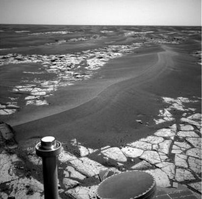 美国宇航局“机遇”号火星车在火星上拍摄到有大片沙浪的高地,在沙浪下面可以看到石块。科学家打算更详细研究火星车驶过这高地时沙丘的排列形状。