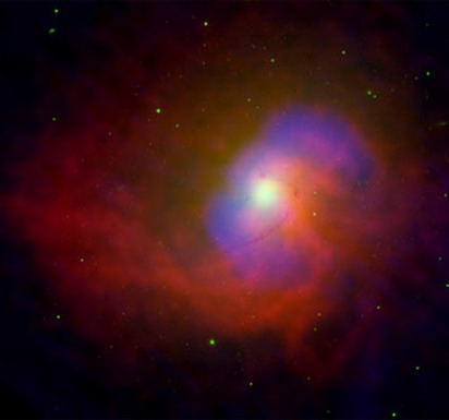 所示照片是“钱德拉”X射线观测望远镜拍摄的,照片上显示的是编号为NGC 4696星系,它离开地球约1.5亿千米。照片中的红色表示直径约为1万光年的炽热气团,在该星系中心有一个明亮活跃核心,而在核心的中心处是一个超巨黑洞。