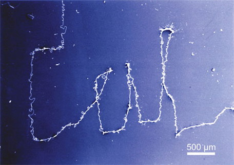 借助于新工艺书写的加利福尼亚大学名称的缩写“cal” 早在72年前科学家就能利用电场将聚合物搓合成微纤维,但是搓合过程进行得非常无序,常常会使纤维乱成一团,因此聚合物纳米纤维或聚合物微纤维迄今为止一直不能在很多工业产品应用。