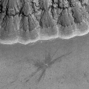 美国宇航局火星全球探测器对名为Labyrinthus Noctis的区域进行拍摄,在照片下部可以清楚地看到因“天外来客”坠落留下的痕迹。