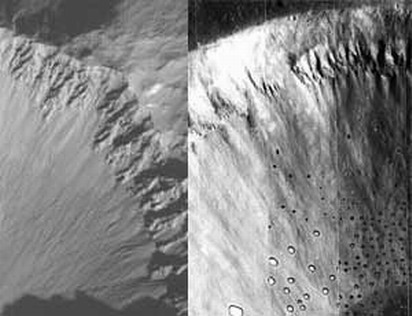 最新研究表明,科学家利用火星全球探测器上的火星轨道照相机在5年前发现的火星上表面“冲刷”不可能是水流引起的。原先认为,这些沟壑在火星上出现比较早,大约是在100万年前形成的,在100万年前火星上存在有液态水。
