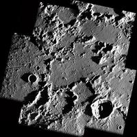 在图片上可以看到的“梅耶尔”陨石坑(右下角)和直径为156千米的“邦达”陨石坑(左边)。