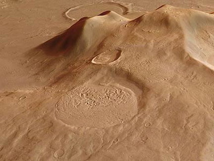 所示照片是目前正在火星轨道上工作的欧洲航天局“火星快车”探测器拍摄的。由山和因陨星撞击留下的陨石坑组成的这种“结构”位于火星南半球Promethei Terra高地(大致坐标为南纬38°和东经104°),从照片上可见,分布在山坡上的两个相邻陨石坑形成在外形上与“沙漏”有某种相似的结构。从外表上看,仿佛有水流(或其他液体)从陨石坑上部向下部流过,同时携带有沉积岩。但是科学家认为,这里多半没有水,同样的地貌会由于冰川和冻结在冰川中的岩石活动而形成,类似结构在地球上的山脉中也很常见。