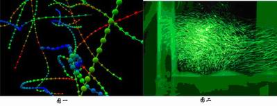 在所示照片中(图一)表示某些粒子在湍流中的轨迹,图中的颜色表示粒子的速度,蓝色表示粒子缓慢的速度,红色表示快速,绿色表示中等速度。在另一幅照片中(图二)表示在湍流中移动的大量聚苯乙烯小球(直径25微米),照片是在绿色激光照明下拍摄的。