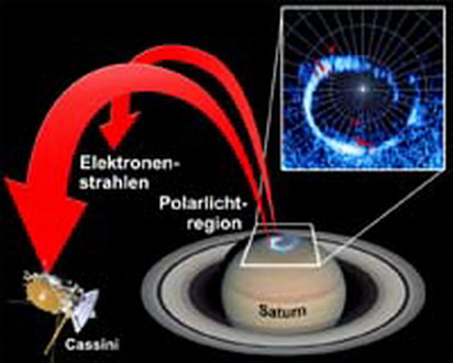 现正在土星周围工作的“卡西尼”号探测器又获得一项新发现,借助于随舱低能磁力测量计(LEMMS)在土星磁场极地附近区域发现有电子,电子从土星飞出,不是像所有“正常”电子那样朝土星方向运动,“反向”电子流是在土星上曾观察到最弱极光或从未观察到极光的地方被发现的。