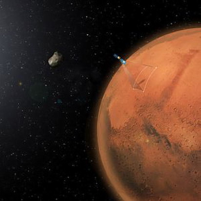 2005年11月10日,“火星快车”探测器利用高分辨率立体照相机(HRSC)拍摄到火卫一阴影沿火星地表移动的照片,当时探测器围绕火星作第2345圈飞行。