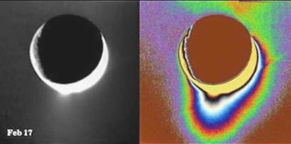 但是“卡西尼”号传送回的信息完全改变了这一景象,现在科学家认为,土卫二在地质学上很活跃,尤其是较温暖的南极特别活跃,土卫二拥有自己的大气,在大气中存在有水。“温暖”一词在这里是相对的,然而这些区域的温度(最温暖处的温度为-182℃和-183℃)与周围其他地区的温度(-198℃至-191℃) < 1 > < 2 >
