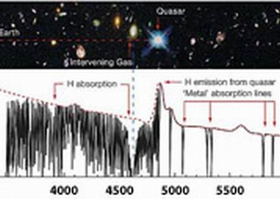 这星系如此遥远,发出的光又如此微弱,因此无法直接发现它,但是在类星体光谱中的吸收