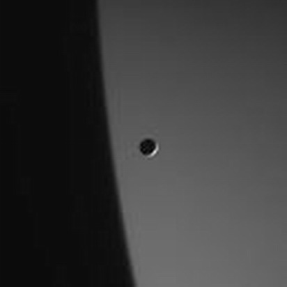 所示照片上的一个带有亮边的黑色小圈就是土星的小卫星——土卫一,而土卫一所在背景上的灰色巨物正是土星,土卫一的平均半直径为397千米,因此与土星相比较简直是 “侏儒”。