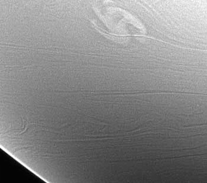 1月27日“卡西尼”号照相机在土星夜空方向拍摄到这次强雷暴的照片,由于光从土星光环上反射观察到强雷暴,这反射光足以见到其他大气现象。