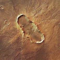 “蝴蝶”陨石坑位于Hesperia Planum平原,陨石坑从西北向东南方向延伸,其长度为24.4千米,宽度为11.2千米,而深度约为650米。