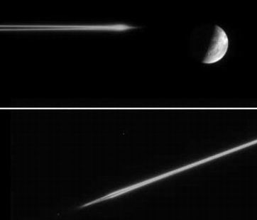 美国宇航局“卡西尼”号探测器拍摄到土星F光环全新照片,拍摄时“卡西尼”号照相机几乎与光环处于同一平面上(相差不到0.1度),因此在拍摄的照片上光环看上去呈一条细线状,但是它的一端却反常变粗。科学家暂时还没有对这一效应是由什么原因引起的作出解释。直径约为1千米的凸起可能是被邻近光环引力场吸引的尘埃或粒子团,或者是被邻近小卫星天体所吸引,值得一提的是,在“航行者号”探测器拍摄的照片上出现过这样的小卫星天体。