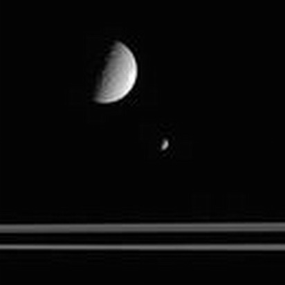 所示照片是目前正工作在土星轨道上“卡西尼”号探测器利用窄角照相机拍摄的。照片下部的两条平行线条是土星光环,光环上方是两颗土星卫星:大的是土卫五,小的是土卫一。
