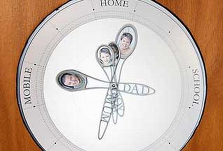 在钟的“时”针上显示的是家庭每个成员的照片,“时”针指示的地方正是该时刻家庭某个成员所在地方,比如在班上、在学校、在家里或在某个地方。为了确定家庭成员的位置可以利用他们携带的手机信号,手机应该与GPS导航系统相连接。当家庭成员一打开自己的手机,他的位置便会立刻被电脑记录下来。