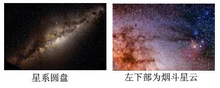 从地球黑暗一角或几乎完全没有人工照明的地方可以看到银河星系圆盘,星系圆盘以冲蚀带状横贯天空,带状由炽热星云、几十亿颗恒星和冷尘埃组成。同时尘埃数量如此之巨大,星系中心几乎无法利用可见光看到。