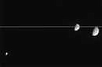 这幅令人惊奇的照片是“卡西尼”号探测器在2004年7月在土星轨道上拍摄的,同时进入“卡西尼”号照相机镜头的有土星三颗卫星,它们的表面都覆盖有冰层。
