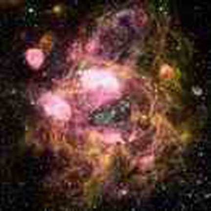 沿整个N11星云及其周围分散有新星形成区域,在照片上呈明亮玫瑰色,在那里有气体和尘埃凝聚物,气体和尘埃凝聚物旋转成强烈旋涡,新星正是诞生于这些旋涡中。在气体和尘埃环中心的黑暗背景上可以清楚地看到一个十分密实的恒星群,这就是编号为NGC 1760(另一个名称叫LH9)的分散星团。
