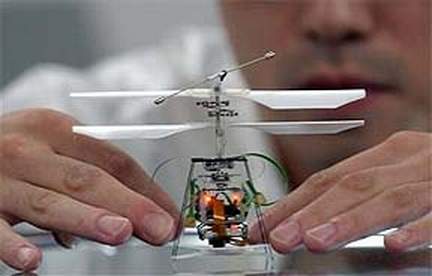 日本精工爱普生公司研制成一种微型飞行机器人,它能用于安全领域作为营救机器人,也可以用来研究太空。取名为“微型飞行机器人”,看上去像一架直升机,总长8.5厘米,重12.3克,其内部安装有微处理机、发动机和数码相机。