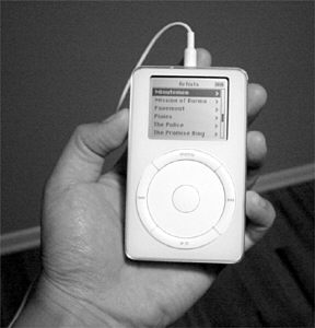 iPod:苹果计算机公司推出的音乐播放器,它能播放MP3、WAV、AAC/M4A和AIFF多种文件。iPod也作为外接硬盘使用。其主要特点是体积小、用户界面简单、1394连接(FireWire)快速。MP3:一种音频压缩运算法,它能极大地减少复制音频信号的数据量,而同时为听众提供原始音频信号的复制品。