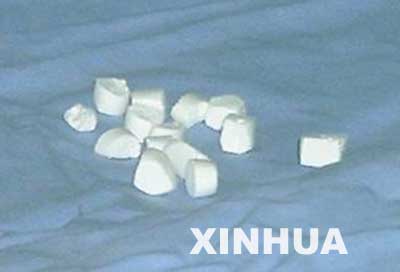这是2004年5月25日拍摄的我国第一项纳米医药产品——纳米人工骨颗粒。 经过16个月、近300例的人体临床实验,由清华大学材料系崔福斋教授课题组研制成功的纳米人工骨日前获得国家食品药品监督管理局的三类植入产品试生产注册证,成为我国第一项可在市场上公开销售和应用的纳米医药产品。