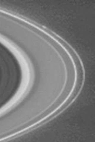 “卡西尼”号探测器正向土星飞去,它将会在今年7月1日进入土星轨道。“卡西尼”号面临许多任务,其中之一是测定土星环上凝结物的特性。今年2月23日“卡西尼”号摄像机从6290万千米之外拍摄到外表细环F上的这些凝结物,摄像机利用波长为568纳米的绿光滤色镜,照片分辨率为377千米每线。两幅照片拍摄时间相隔2小时,其中一幅照片显示,凝结物与环的其他颗粒一起在围绕土星旋转,环的旋转方向与土星旋转方向相同。F环主要部分宽度仅为50千米,“卡西尼”号即使不能处处仔细观察这环,但能使科学家获得反差更为强烈的图像,从而能区分开环本身与环上的凝结物。