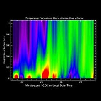 “勇气”号火星车测量了火星大气的温度范围,新数据表明火星气温的变化非常快。在清晨火星空气温度可以每分钟上升4度,这是指地表附近局部地段的空气温度变化,那里的空气会快速被加热并上升。这很像地球上正在上升的气流,地球上的鸟类和三角翼滑翔爱好者喜欢利用这样的上升气流。