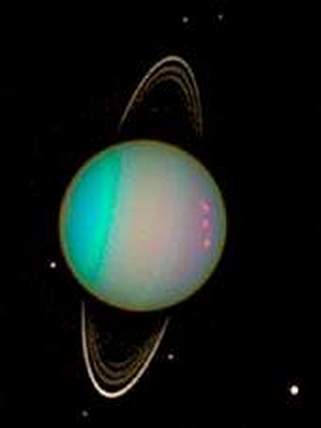 另外,在图5可以看到一条细细的星环以及它的6颗卫星:右下角最明亮的天王卫一,沿顺时针方向的天王卫五、天王卫二(照片下边的暗斑)、天王卫三、天王卫四和天王卫六(中心偏右)。天王星现在已知拥有25颗卫星。