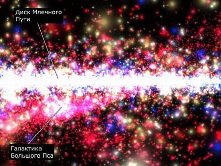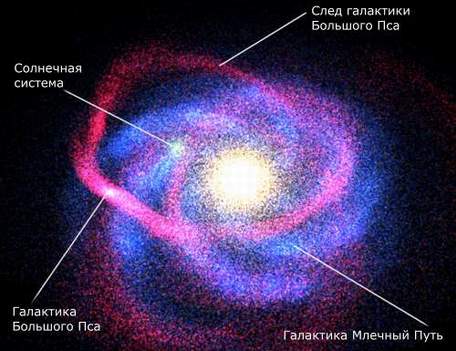 从地球上看到的大犬星系模拟图 银河引力将大犬星系撕裂成几部分 一个由意大利、法国、英国和澳大利亚天文学家组成的研究小组发现一个原先未知的星系,它体积很小,而且非常接近我们的银河,实际上它已经与我们银河相碰撞,它距太阳系仅为25000光年。尘埃云团原先妨碍我们观测到该星系,天文学家将位于大犬星座方向上的该星系命名为大犬星系。