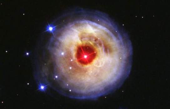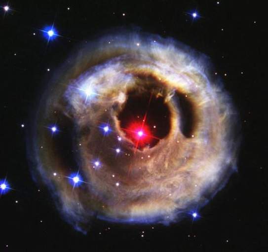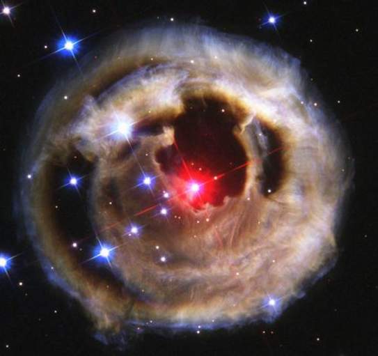 “哈勃”太空望远镜在2002年5月拍摄的,恒星位于星际尘埃团中心 天文学家观察到,麒麟星座中一颗恒星怎样逐个“吞食”自己的行星。这颗编号为V838 的红巨星的首次爆发是在2002年1月被记录到,在短时间里它成为银河中最明亮的恒星——比我们的太阳明亮60万倍。但是当时科学家还不知道发生了什么,只是到现在才找到解释和原因。