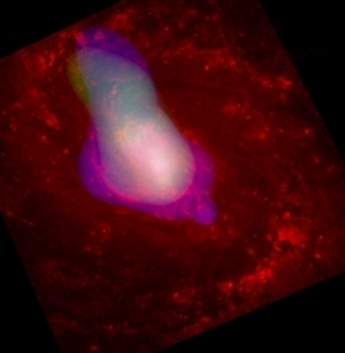 在这幅利用X射线(蓝色和绿色)与可见光(红色)合成的编号为NGC 1068星系的照片上,可以清楚地看到从一个中央超巨黑洞周围喷出(以高速风形式)的物质,无论是利用X射线还是利用可见光波段都能很好地看到该星系旋臂内部的恒星活跃形成区域。看来,气团延伸形状的形成是由于圆环形冷气团和尘埃团影响的结果,冷气团和尘埃团分布在此黑洞的周围,冷气团和尘埃团的质量大约为500万颗太阳。由无线电观察可知,环形气团距黑洞的距离从几光年延伸至约300光年。