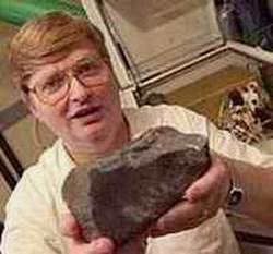 美国哈佛大学地质化学教授斯坦因·雅科布森,对于在各个年代地球表面发现的一系列陨星进行了研究,照片上显示的是他双手拿着1969年在墨西哥发现的Allende球状陨石。通过对这些陨石的研究,他认为,我们地球形成的年代要比原先的研究结果早5000万~9000万年。