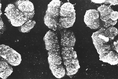 电子显微镜下的人类X染色体和Y染色体 美国科学家最近完成了人类Y染色体的基因测序,发现这个一向被认为脆弱的性染色体,自我保护能力比人们想象的更强。