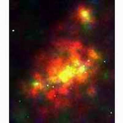 这幅照片是“钱德拉”X射线观测望远镜拍摄的,从照片中可看到两个星系——编号为NGC 4485(图中上部的小星系)和NGC 4490星系。但是这幅照片最引人注目的地方是,几个“点状”X射线源,并且其中有5个“点”非常明亮(与它们类似的几乎没有)。目前,天文学家还不能对它们的存在作出任何解释。