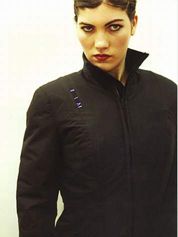 图1 美国麻省理工学院工程师和Advanced Research Apparel公司与DuPont公司工业品美术设计师一起,共同研制成能防止暴徒袭击的女式上衣(图1),名为No-Contact Jacket的电子女上衣能对袭击女主人的暴徒发出8万伏高压脉冲。