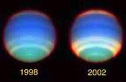 天文学家借助于“哈勃”太空望远镜对海王星进行为期6年的观察表明,海王星这几年开始明显变亮,最明显的变化发生在海王星的南半球:云带变得非常清晰,云带也变得更宽和更亮(见图片)。科学家认为,这说明海王星在发生季节性气候变化,就像我们在地球上观察到的季节性气候变化一样。