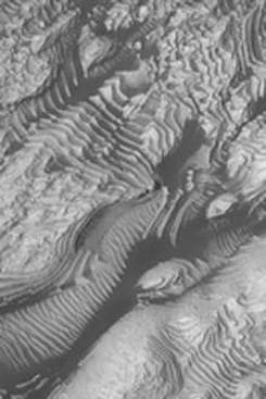 围绕火星轨道运转的火星全球探测器(Mars Global Surveyor)又向地球传送回一批火星地形的奇特照片,这次火星全球探测器成功拍摄到火星上一无名环形山斜坡上的沉积岩(见图片),该环形山位于坐标为北纬8°和西经7°处。
