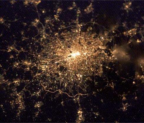 这幅伦敦夜景照片是国际空间站上的宇航员拍摄的,拍摄日期是今年2月4日。伦敦市中心的暗斑是公园,而市区边界外的最亮斑是希思罗机场和盖特威克机场。宇航员利用普通数码照相机——柯达DCS760C拍摄下这幅伦敦夜景。