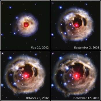 这一系列来自哈勃望远镜所拍摄的照片向我们展示了2002年1月间一颗不寻常的恒星*后产生的光亮回荡的景象。*后所产生的光亮源自一颗奇异的恒星,随着爆发向外层空间散发,产生的光亮映照着四围的气体尘埃壳,使得这些尘埃显示出了壮观的、多色彩的“牛眼”形状。