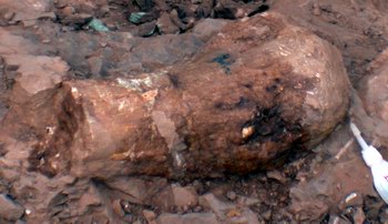 已出土的恐龙骨化石 经过近一周的紧张工作,已发现了恐龙脊柱骨、肋骨、尾脊、小的甲片、前后肢等化石。